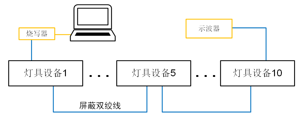我司某燈光設(shè)備客戶反饋,使用SM4500的燈光具設(shè)備以手拉手方式組網(wǎng)后,在進(jìn)行程序燒寫時,出現(xiàn)了部分設(shè)備無法燒錄程序的情況,組網(wǎng)簡要框圖如圖9所示。