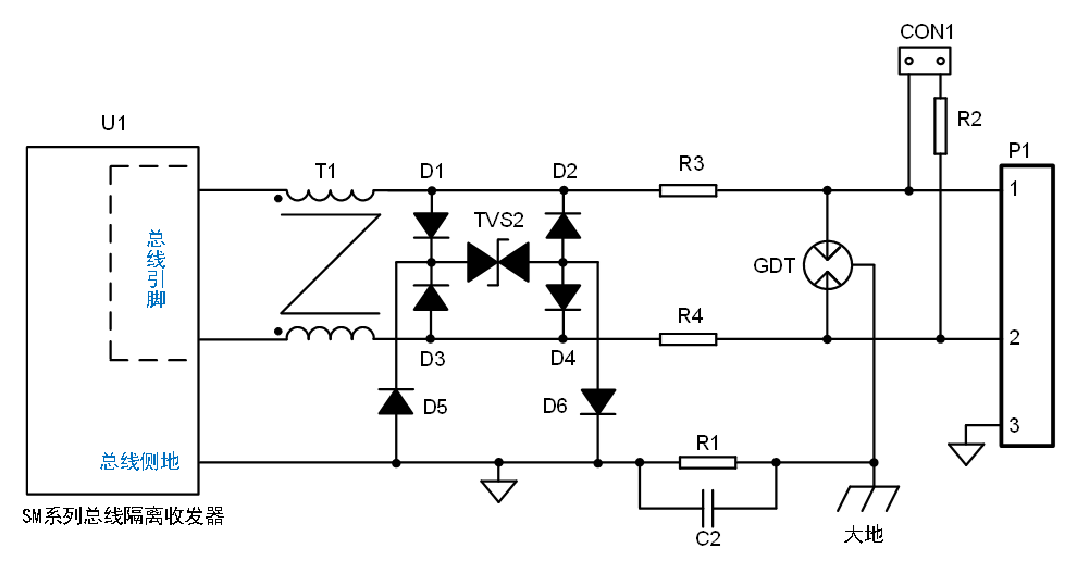 SM1500 CAN接口電容一般只有幾皮法,即使31個節(jié)點(diǎn)組網(wǎng)最多也不過上百皮法,配合終端電阻使用一般不會出現(xiàn)“鐮刀”狀波形。我司在檢查客戶CAN接口電路后發(fā)現(xiàn)存在TVS管、氣體放電管等保護(hù)器件,如下圖5。TVS管本身存在較大的結(jié)電容,一般在幾百到上千皮法,當(dāng)總線組網(wǎng)后結(jié)電容會累計增加,高速通訊的時候總線就有可能出現(xiàn)“鐮刀”狀波形。