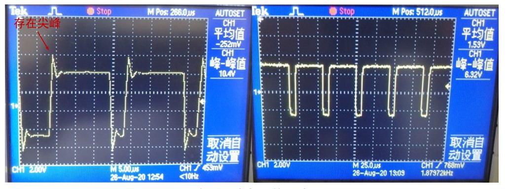 為了確認(rèn)是否是總線外接電容的影響,我司用13臺去掉了電容的設(shè)備組網(wǎng),并測試第13節(jié)點(diǎn)處波形,總線“鐮刀”狀波形消失,如圖12左圖,但波形存在尖峰,我司判斷這由于信號反射導(dǎo)致,給第13臺設(shè)備端接入120Ω終端電阻后,尖峰消失,如圖12右圖。