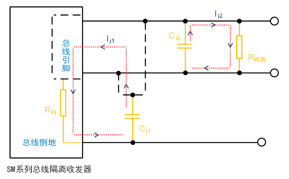 如圖4,總線等效電容Cj包括總線引腳對地電容Cj1與總線之間的電容Cj2,當(dāng)總線電平由高變低時(壓差變化),由于電容上的電壓不能突變,那么電容Cj會分別通過內(nèi)阻R內(nèi)和終端電阻R終端放電。收發(fā)器內(nèi)阻和終端電阻一般固定,當(dāng)電容過大時,則放電時間變長,從而導(dǎo)致了總線波形邊沿變緩。