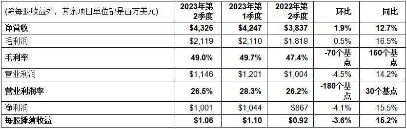 ?第二季度凈營收43.3億美元; 毛利率49.0%;營業(yè)利潤率26.5%; 凈利潤10.0億美元