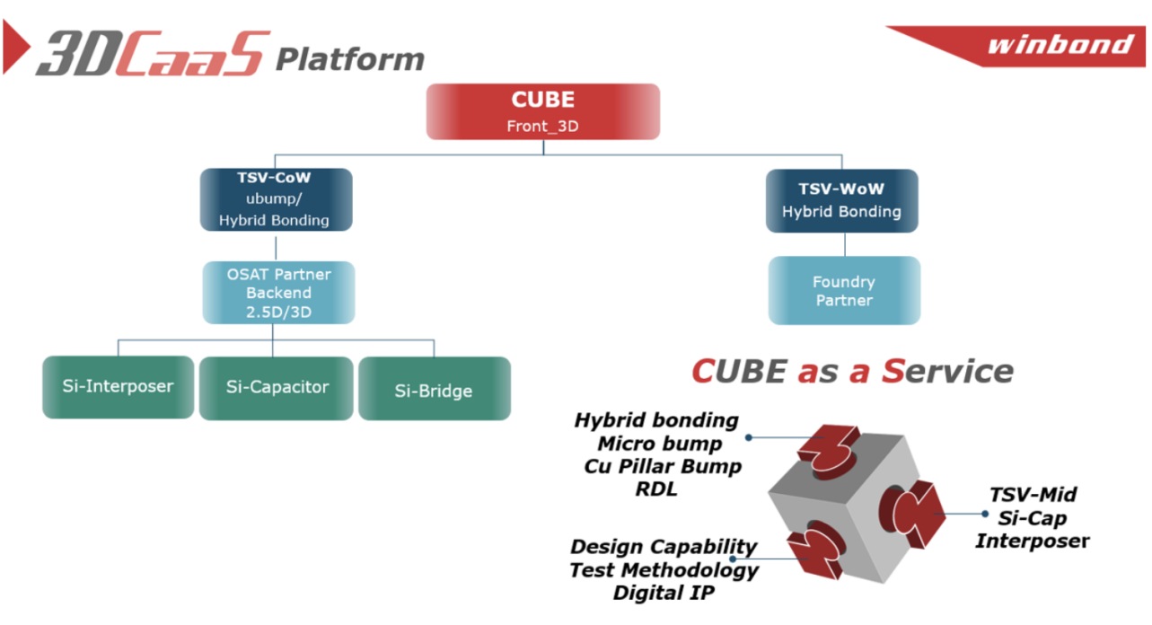 CUBE作為半定制化的產(chǎn)品,同時(shí)也為客戶(hù)提供了設(shè)計(jì)和制造相關(guān)的服務(wù)支持,CUBE as Service是其產(chǎn)品口號(hào)。舉例而言,在最初的客戶(hù)產(chǎn)品定義階段,雙方就會(huì)先基于客戶(hù)想要的用途和效果來(lái)確定CUBE的規(guī)格;而后在產(chǎn)品的制造過(guò)程中,華邦又可以提供領(lǐng)先的DRAM TSV工藝,幫助客戶(hù)讓裸片變成更薄、尺寸更??;此外因?yàn)閮?nèi)存廠商更擅長(zhǎng)電容的設(shè)計(jì)制造,所以有時(shí)候客戶(hù)的芯片設(shè)計(jì)中涉及到硅電容的制作也可以在CUBE側(cè)完成。