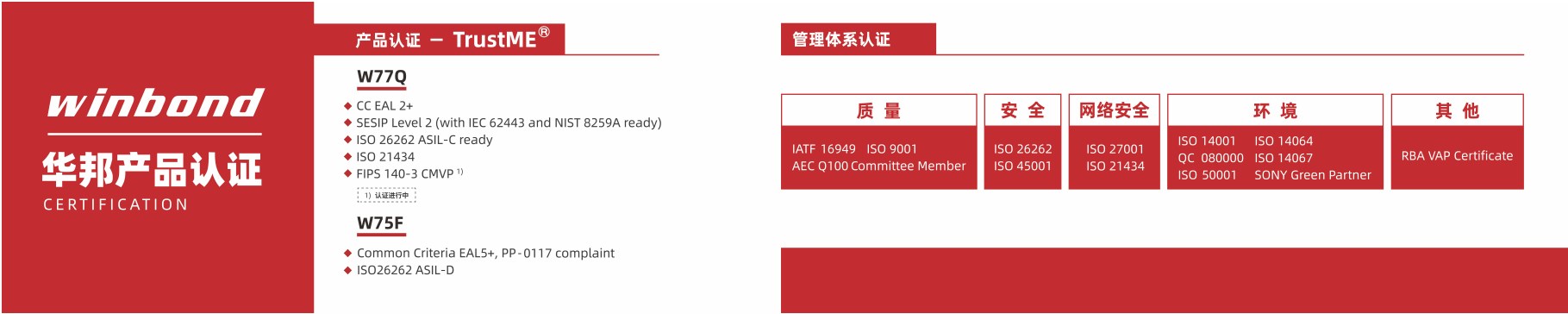 華邦的TrustME®W77Q系列安全閃存產(chǎn)品不僅取得了ISO 26262認(rèn)證,也取得了ISO 21434認(rèn)證,既滿(mǎn)足功能安全、又能滿(mǎn)足信息安全。