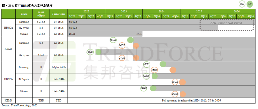 HBM3e將由24Gb mono die堆棧,在8層(8Hi)的基礎下,單顆HBM3e容量將一口氣提升至24GB,此將導入在2025年NVIDIA推出的GB100上,故三大原廠預計要在2024年第一季推出HBM3e樣品,以期在明年下半年進入量產(chǎn)。