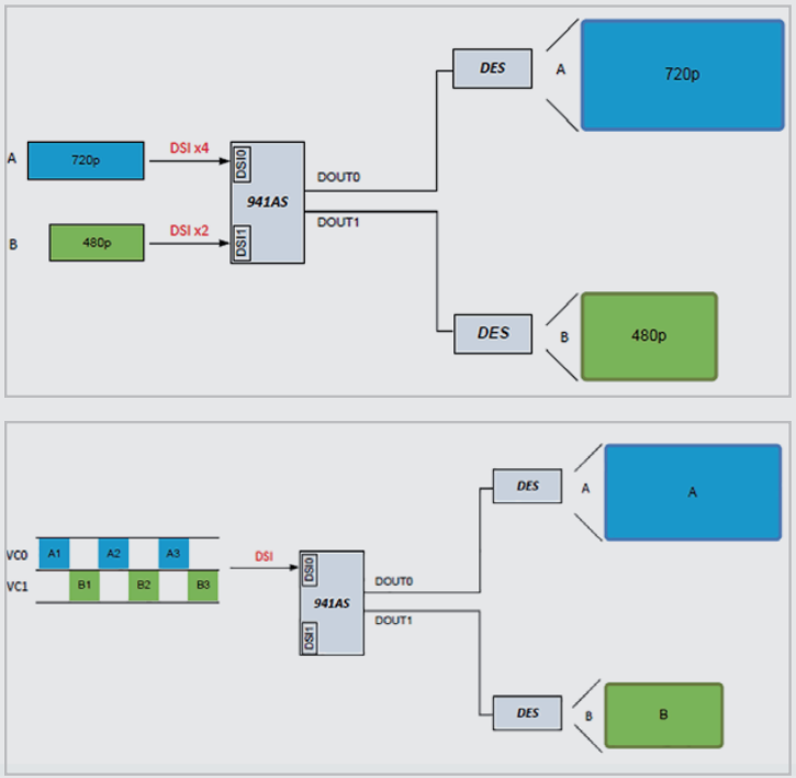 而采用FPD-LINKIII的串行器和解串器,可以靈活的通過一路或多路DSI接口,利用虛擬信道或者同步、異步的分割方式實現(xiàn)在多個顯示屏的輸出,如下圖所示: