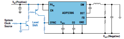 反相降壓-升壓電路產(chǎn)生的負電壓幅度可以高于或低于可用正電壓的幅度。例如,從+12 V可以生成-8 V,甚至-14 V。當使用具有反相降壓-升壓電路的開關穩(wěn)壓器IC時,系統(tǒng)可能需要設計通信引腳。如果確實需要,設計人員必須進行充分的電平轉換,以便可以利用同步和使能信號。