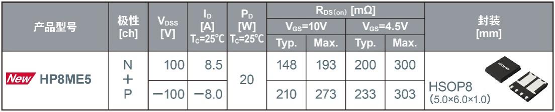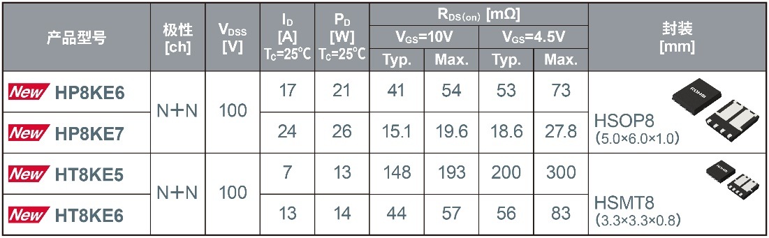 ROHM新增5款100V耐壓雙MOSFET 以5.0mm×6.0mm和3.3mm×3.3mm尺寸實現(xiàn)業(yè)界超低導(dǎo)通電阻