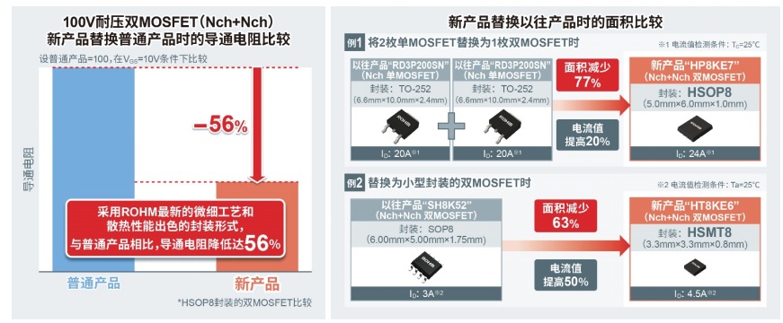 新產(chǎn)品通過采用ROHM新工藝和背面散熱封裝,實現(xiàn)了業(yè)界超低的導(dǎo)通電阻(Ron)*3(Nch+Nch產(chǎn)品為HSOP8:19.6mΩ、HSMT8:57.0mΩ)。與普通的雙MOSFET相比,導(dǎo)通電阻降低達56%,非常有助于進一步降低應(yīng)用設(shè)備的功耗。另外,通過將兩枚芯片一體化封裝,可以減少安裝面積,有助于應(yīng)用設(shè)備進一步節(jié)省空間。例如HSOP8封裝的產(chǎn)品,如果替換掉兩枚單MOSFET(僅內(nèi)置1枚芯片的TO-252封裝),可以減少77%的安裝面積。