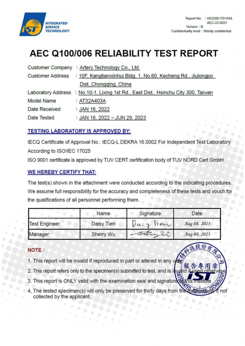 AEC-Q100認(rèn)證是汽車(chē)電子委員會(huì)(Automotive Electronics Council)制定的車(chē)用電子元件可靠性測(cè)試標(biāo)準(zhǔn),在全球汽車(chē)產(chǎn)業(yè)都具有極高的權(quán)威性。AEC-Q100認(rèn)證門(mén)檻高,測(cè)試項(xiàng)目覆蓋廣,對(duì)芯片產(chǎn)品的設(shè)計(jì)質(zhì)量、安全性、可靠性要求極為嚴(yán)苛,是集成電路廠家進(jìn)入汽車(chē)領(lǐng)域的重要通行證。AT32A403A通過(guò)AEC-Q100認(rèn)證,標(biāo)志著雅特力車(chē)規(guī)級(jí)MCU性能與可靠性等指標(biāo)符合國(guó)際車(chē)規(guī)芯片標(biāo)準(zhǔn),產(chǎn)品質(zhì)量獲得國(guó)際權(quán)威認(rèn)證體系的認(rèn)可和肯定。