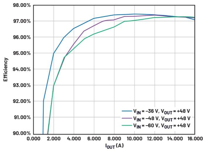 同樣,MAX15258本質(zhì)上是一個以相對較低的頻率運行的升壓轉(zhuǎn)換器。這自然會降低開關損耗,而開關損耗是這些轉(zhuǎn)換器中最重要的功率損耗因素。該器件支持高達1 MHz的開關頻率。在多相操作中,各相并行運行,并且都以相同的頻率運行(但交錯)??偟刃ьl率為N × Freq,其中N是相數(shù),但損耗是每個轉(zhuǎn)換器的頻率損耗。交錯實現(xiàn)方案會在一定程度上抵消輸出電容的紋波電流。輸入紋波電流大大降低,因此可以使用更小的輸入電感。使用ADI獲得專利的耦合電感(CL)技術還有助于衰減輸出紋波電流,從而可以使用較便宜且紋波電流額定值較低的電容。這導致效率提高,同時總體PoL PCB尺寸減小。本質(zhì)上,它以很高的等效總頻率提供大量輸出功率,但每個轉(zhuǎn)換器在低損耗區(qū)域以低頻率運行。通過這一巧妙設計,使MAX15258成為-48 VDC轉(zhuǎn)換的先進解決方案。
