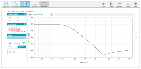 輸入規(guī)格后,左鍵單擊圖8中顯示的“components”(元件)按鈕。在此窗口中,單擊元器件選項(xiàng)卡中的“I want to choose”(我想要選擇)之后,不僅可以選擇電阻和電容的值,還可以選擇運(yùn)算放大器基準(zhǔn)電壓源。您還可以選擇將濾波器實(shí)現(xiàn)為Sallen-Key型還是多反饋型。為了盡可能接近設(shè)計(jì)步驟,這里選擇LTC2066。該工具還會(huì)提供電阻和電容的標(biāo)準(zhǔn)值,同樣,我們將選擇盡可能接近以上計(jì)算值的元件。