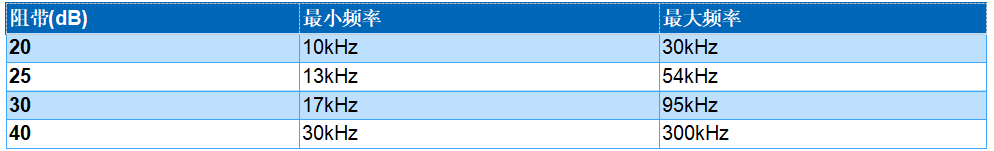 使用此工具的第一步是參考目標(biāo)低通濾波器設(shè)計(jì)的規(guī)格。為了實(shí)現(xiàn)僅有一級(jí)的二階濾波器,阻帶規(guī)格需要滿足某些要求。根據(jù)阻帶的分貝(dB)值的不同,二階濾波器的頻率間隔是不同的。當(dāng)為不同的阻帶dB值選擇3kHz的截止頻率時(shí),設(shè)置二階濾波器的頻率間隔如表2所示。