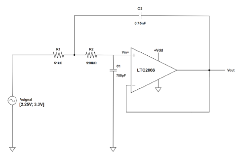 圖4顯示了電路的整體原理圖,其中選擇LTC2066來(lái)實(shí)現(xiàn)Sallen-Key、雙極點(diǎn)、單位增益的低通濾波器。