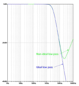 不僅應(yīng)該監(jiān)視Sallen-Key濾波器的高頻特性,而且必須知道它在什么頻率開(kāi)始再次提高,如圖6中的綠色曲線所示部分,而藍(lán)色曲線是理想特性。此限制被稱為阻帶限制。