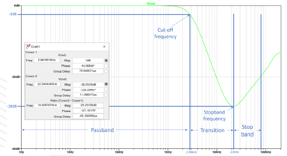 在規(guī)格窗口中可以檢索幅度視圖。這是濾波器在理想條件下的頻率輸出的樣子。在高頻時(shí),濾波器的確是不斷滾降。