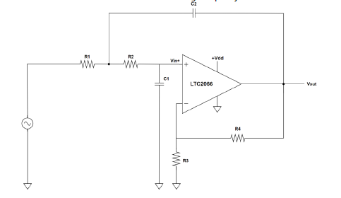 單級(jí)Sallen-Key濾波器由有源器件(運(yùn)算放大器)和無(wú)源元件(電阻和電容)組成。運(yùn)算放大器的電壓增益由一個(gè)雙電阻分壓器設(shè)置,運(yùn)算放大器用于抑制超范圍信號(hào)。本文討論一個(gè)針對(duì)低功耗應(yīng)用的濾波器電路設(shè)計(jì)示例。所討論的原則適用于一般的濾波器設(shè)計(jì)。該設(shè)計(jì)使用10μA電源電流、低IB、零漂移運(yùn)算放大器LTC2066。我們的低功耗信號(hào)鏈產(chǎn)品系列中還有其他運(yùn)算放大器可以提供相似的結(jié)果(AD8505、LTC6258、LTC2063、ADA4505、MAX40023、MAX40108)。