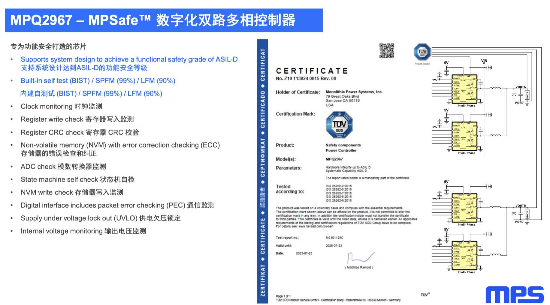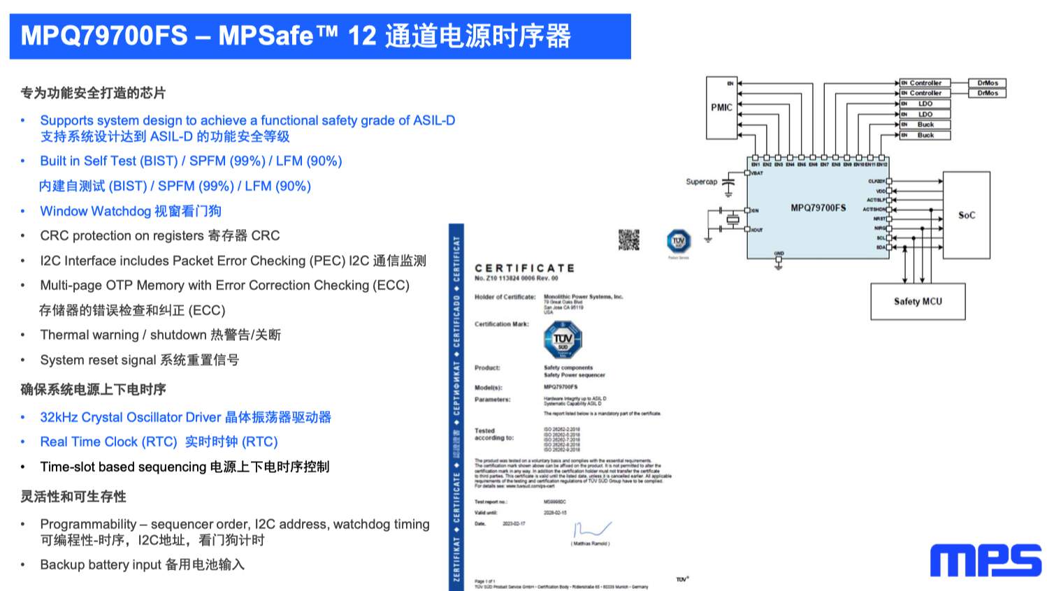 MPQ79700主要用于控制SoC的上下電時(shí)序,內(nèi)部也有像CRC check、I2C check、內(nèi)存檢測(cè)等各種監(jiān)測(cè)功能,同樣也獲得了TUV-SUD認(rèn)證。