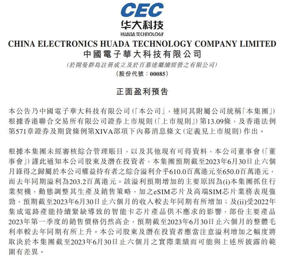 另一家在6月16日就搶先發(fā)布23H1正面盈利預(yù)告的企業(yè)是央企中國(guó)電子信息產(chǎn)業(yè)集團(tuán)(CEC)旗下的香港上市公司中電華大科技(00085.HK),該公司全資持有國(guó)內(nèi)最早的自主純芯片設(shè)計(jì)公司北京中電華大電子設(shè)計(jì)有限公司,主要產(chǎn)品是智能卡芯片、安全芯片、集成安全芯片的安全MCU以及數(shù)字人民幣硬錢包套片等。該公司預(yù)告稱:其前六個(gè)月的盈利有望達(dá)到6.5億港元,而去年同期的盈利為2.03億港元,同時(shí)6.5億港元的凈利潤(rùn)已經(jīng)超過(guò)了其去年全年的凈利潤(rùn)。