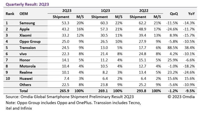 市場(chǎng)研究公司Omdia發(fā)布的2023年第二季度全球智能手機(jī)市場(chǎng)數(shù)據(jù)