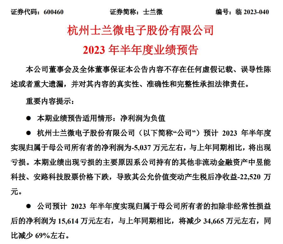 再來(lái)看一則非常有趣的業(yè)績(jī)預(yù)告,也許可以幫助大家緩解目前的焦慮。杭州士蘭微電子股份有限公司(600460)預(yù)計(jì) 2023 年半年度實(shí)現(xiàn)歸屬于母公司所有者的凈利潤(rùn)為-5,037 萬(wàn)元左右;與上年同期相比,將出現(xiàn)虧損。本期業(yè)績(jī)出現(xiàn)虧損的主要原因系公司持有的其他非流動(dòng)金融資產(chǎn)中昱能科技(688348)、安路科技(688107)的股票價(jià)格下跌,導(dǎo)致其公允價(jià)值變動(dòng)產(chǎn)生稅后凈收益-2.25億元。