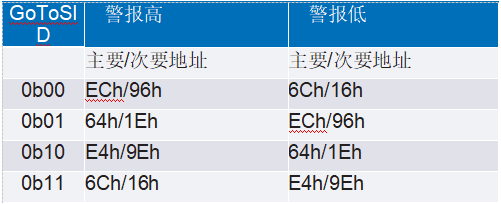 表4中的數(shù)據(jù)來自MAX17330數(shù)據(jù)手冊,顯示了I2CCmd寄存器如何根據(jù)ALERT GPIO引腳值動態(tài)更改器件地址。在這種情況下,可使用GoToSID和INcSID字段更改I2C地址: