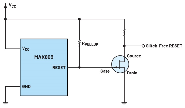上電期間,F(xiàn)PGA、ASIC或數(shù)字信號(hào)處理器需要處于RESET狀態(tài),直到所有電源軌穩(wěn)定。當(dāng)VCC低于VPOR時(shí),RESET引腳可能會(huì)出現(xiàn)毛刺,該毛刺可能會(huì)觸發(fā)FPGA的未知狀態(tài)。一旦VCC高于VPOR,內(nèi)部MOSFET就會(huì)開(kāi)啟,并將RESET連接到GND,使RESET引腳輸出正確的邏輯低電平。