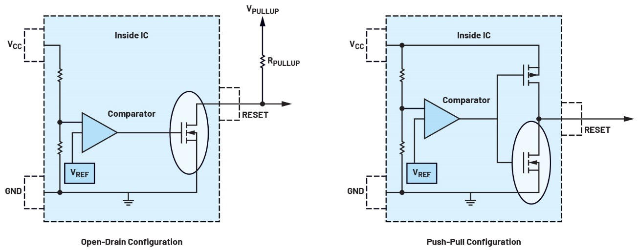復(fù)位引腳主要有兩種不同的拓?fù)浣Y(jié)構(gòu):開(kāi)漏和推挽(圖1)。兩種拓?fù)浣Y(jié)構(gòu)都使用NMOS作為下拉MOSFET。