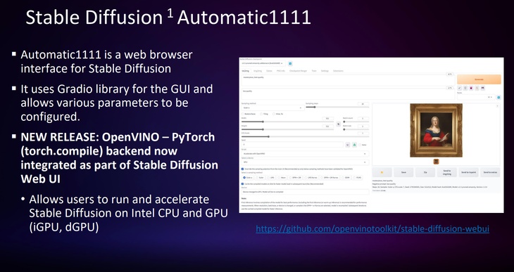 英特爾積極擁抱AI社區(qū),基于OpenVINO PyTorch后端的方案,通過Pytorch API讓社區(qū)開源模型能夠很好地運行在英特爾的客戶端處理器、集成顯卡、獨立顯卡和專用AI引擎上。以圖形視覺領(lǐng)域為例, Stable Diffusion的實現(xiàn)Automatic1111 WebUI,已經(jīng)能通過上述方式,在英特爾客戶端平臺的CPU和GPU(包括集成顯卡和獨立顯卡)上運行FP16精度的模型,用戶可以在文字生成圖片、圖片生成圖片以及局部修復(fù)等功能上獲得良好的使用體驗。