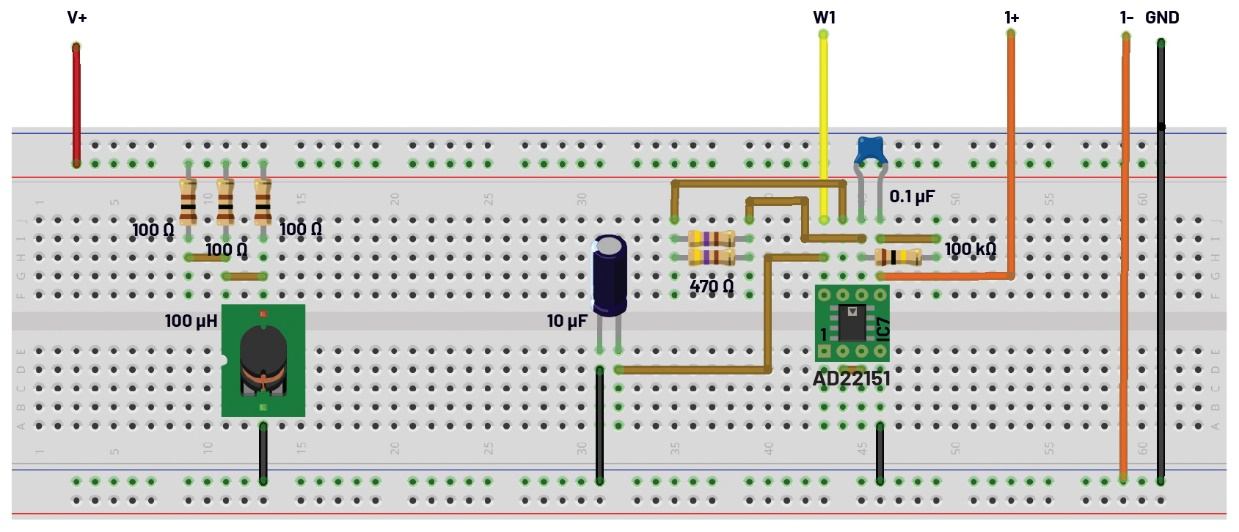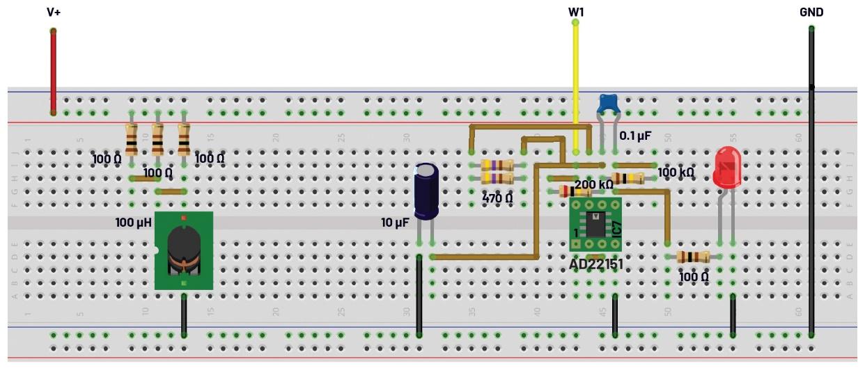 將包含AD22151磁場(chǎng)傳感器的霍爾效應(yīng)傳感器電路(圖2)添加到無焊試驗(yàn)板中。