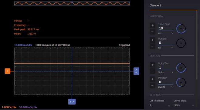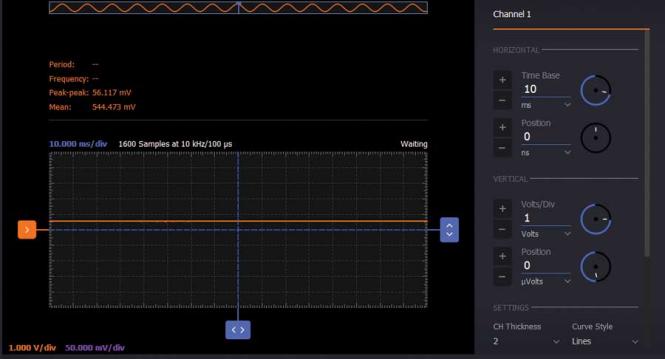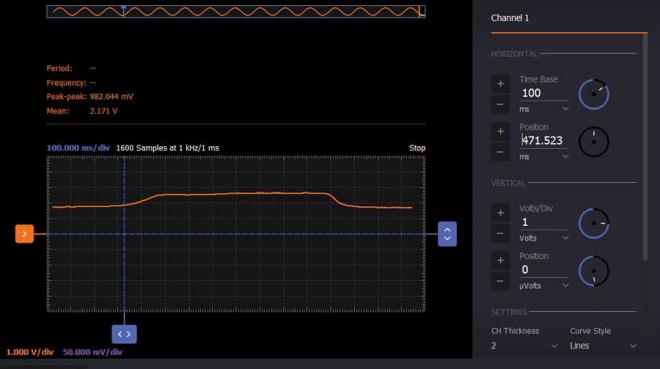 使用信號(hào)發(fā)生器W1生成一個(gè)恒定的5 V信號(hào),作為AD22151的VCC輸入。打開至5 V的正電源,為電磁體供電。當(dāng)電磁體遠(yuǎn)離芯片且傳感器附近不存在磁場(chǎng)時(shí),示波器的通道1將顯示AD22151的輸出。