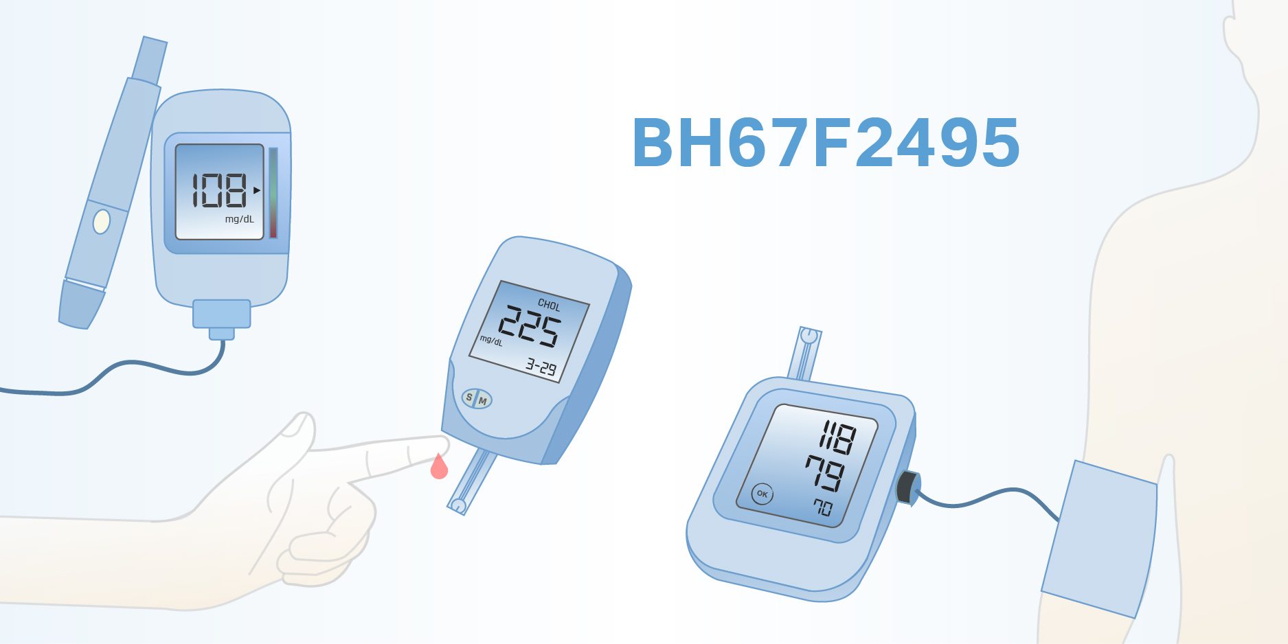 BH67F2495內建完整MCU資源,與模擬前端電路,可支持多種阻抗測量、電化學測量與各樣生理信號測量之組合應用。內建USB驅動器可支持USB通信;內建LCD驅動器具備恒定亮度功能;支持多種傳輸接口,包含I2C、SPI與UART。