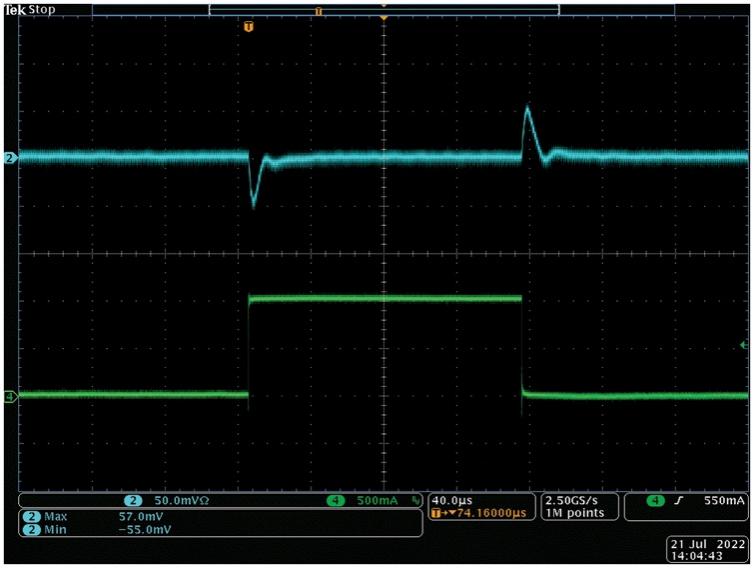 在評估電壓軌以確保輸出處于推薦工作條件范圍內(nèi)的過程中,以非??焖偾曳浅8叩呢?fù)載階躍作為激勵來評估負(fù)載瞬態(tài)響應(yīng)。階躍負(fù)載設(shè)置為0 A至1 A階躍,擺率為10 A/μs,脈沖持續(xù)時間為150 μs。圖7顯示了VDD_1V8電壓軌的瞬態(tài)負(fù)載響應(yīng)。上方波形CH2顯示輸出響應(yīng),下方波形CH4顯示輸出負(fù)載電流。