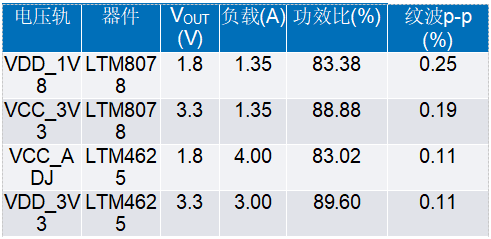 可從ADI公司客戶辦公室解決方案部門獲取所有電壓軌的完整數(shù)據(jù),表7中選定的一些電壓軌顯示了1.35 A LTM8078和3 A/4 A LTM4625輸出的典型代表性能。