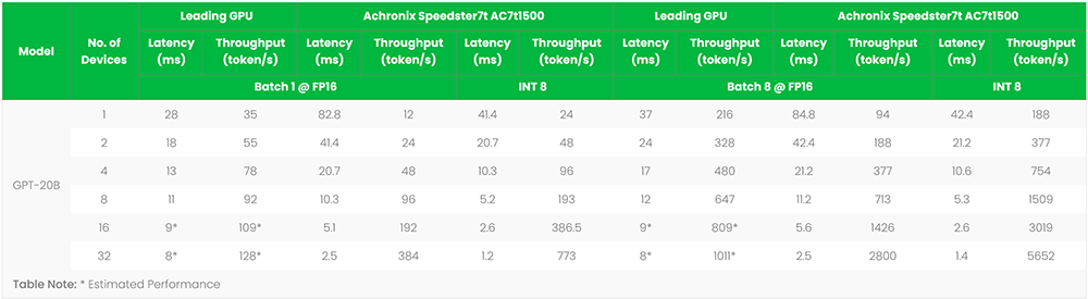 當(dāng)系統(tǒng)規(guī)模擴(kuò)展到需要超過8個處理器件時(GPT3的訓(xùn)練需要使用10,000個GPU),用Achronix的FPGA來執(zhí)行大語言模型可在吞吐量和延遲方面勝過GPU。如果模型可以使用INT8精度,那么使用GPT-20B作為參考的Achronix FPGA則具有更大的優(yōu)勢,如下表所示。這些數(shù)據(jù)說明使用FPGA是有優(yōu)勢的,因為GPU需要較長的交付時間(高端GPU超過一年)、得到的用戶支持可能也很少,并且比FPGA貴得多(每塊GPU的成本可能超過10,000美元)。