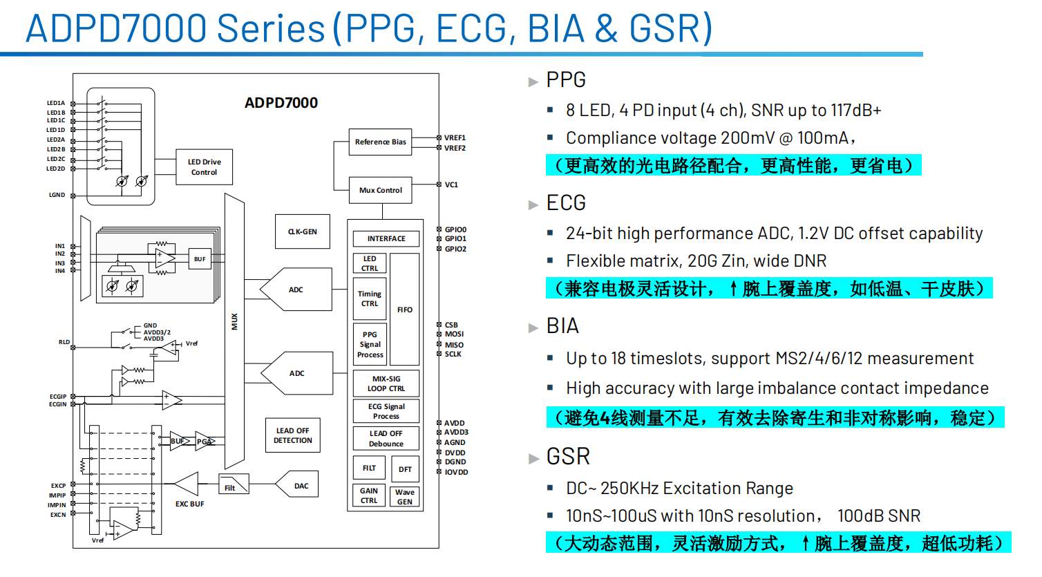 “目前,可穿戴設(shè)備為了更好地支持各項生命體征監(jiān)測,實現(xiàn)最大程度的人群覆蓋度和準(zhǔn)確度,正在向更高性能的方向發(fā)起沖擊?!盇DI中國產(chǎn)品事業(yè)部高級市場應(yīng)用經(jīng)理何源在最近的一次采訪中如此表示,并且ADI最新發(fā)布的可穿戴健康領(lǐng)域的產(chǎn)品——多合一的健康傳感器模擬前端芯片ADPD7000就很好地為他的觀點做了背書。作為VSM的最新款產(chǎn)品,ADPD7000系列專為測量各種生命體征信號而設(shè)計,適用于可穿戴式VSM設(shè)備。在上一代的基礎(chǔ)上,ADPD7000新增皮膚電活動(GSR)測量功能,再集光電體積脈搏波(PPG)、心電圖(ECG)、身體阻抗分析(BIA)四合一,實現(xiàn)了更準(zhǔn)確的血氧、心率、心電、體脂甚至是情緒反應(yīng)等人體生理特征指標(biāo)的監(jiān)測。