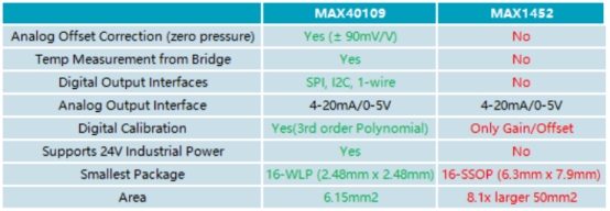 數(shù)字化變送器采用高度集成的處理器電路,可對信號進(jìn)行線性化校準(zhǔn)、溫度補(bǔ)償,彌補(bǔ)了模擬變送器在線性度、溫漂等諸多方面的不足,大大提高了壓力變送器在全溫區(qū)的精度等級。ADA4558提供了符合LIN2.1標(biāo)準(zhǔn)接口的解決方案,MAX1452提供了工業(yè)級、汽車級的解決方案,MAX40109作為MAX1452的升級產(chǎn)品也即將推出。
