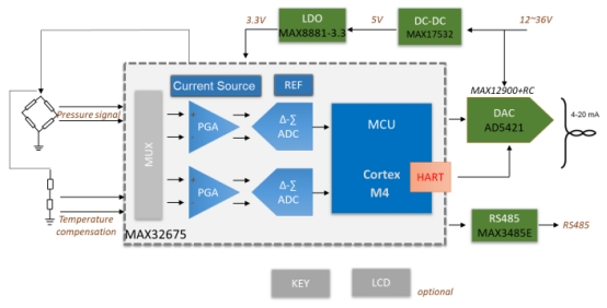 壓力變送器是許多工業(yè)設(shè)備中用于控制工業(yè)過程和壓力變化的重要元件,可用于測量壓力、液位、流速、密度等。通常,變送器可采用電池、線路電源、環(huán)路電源供電,并包括電源、信號調(diào)理、ADC、處理器、顯示器、鍵盤、通訊等模塊。目前變送器市場熱度高漲,HART、PROFIBUS、Modbus、IO-Link等最新技術(shù)也被引入應(yīng)用中,使得應(yīng)用場景得到了跨越式發(fā)展。那要如何設(shè)計(jì)出適當(dāng)?shù)淖兯推飨到y(tǒng)呢?