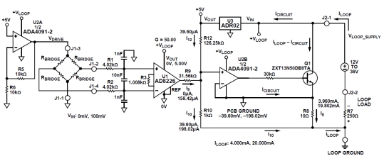該電路有三個重要的電路級:傳感器激勵驅(qū)動、傳感器輸出放大器和電壓-電流轉(zhuǎn)換器。傳感器激勵可通過跳線切換電壓、電流驅(qū)動,傳感器最大驅(qū)動電流為2mA。傳感器輸出采用帶寬為39.6 kHz的共模濾波器(4.02 kΩ、1 nF)以及帶寬為2 kHz的差模濾波器(8.04 kΩ、10 nF)濾波;AD8226是理想的儀表放大器選擇,因?yàn)樗哂械驮鲆嬲`差(0.1%,B級)、低失調(diào)(G = 50時58μV,B級;G = 50時112μV,A級)、出色的增益非線性度(75 ppm = 0.0075%)以及軌到軌輸出特性。