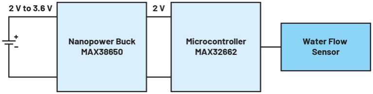采用電池供電的電路必須具備高能效,這樣電池才能長(zhǎng)時(shí)間持續(xù)供電。為此,應(yīng)當(dāng)選擇節(jié)能型元器件并將其整合到系統(tǒng)中。電路中的構(gòu)建模塊越少,整個(gè)系統(tǒng)的能效就越高。圖1所示的電水表就是一種電池供電設(shè)備。該系統(tǒng)采用MAX32662微控制器,僅有一個(gè)電源電壓。輸入電壓介于1.71 V和3.63 V之間。