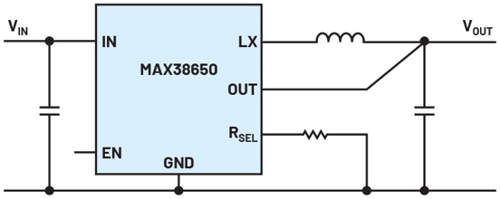 如圖3所示,電路僅需要少量無源外部元件。僅使用RSEL引腳上的一個(gè)電阻來設(shè)置輸出電壓,并未使用電阻分壓器。電阻分壓器會(huì)消耗相當(dāng)多的電流,根據(jù)電壓和電阻的不同,此電流可能大大超過MAX38650的靜態(tài)電流。因此,該IC使用可變電阻,僅在電路接通時(shí)短暫檢查此電阻。該IC通過以下方式檢測(cè)設(shè)定點(diǎn)輸出電壓值:在接通期間的短時(shí)間內(nèi),使200 μA的電流流過該可變電阻。然后測(cè)量所產(chǎn)生的電壓,并將其存儲(chǔ)在IC內(nèi)部。這意味著,在通過常規(guī)分壓器運(yùn)行期間不會(huì)有能量損失。