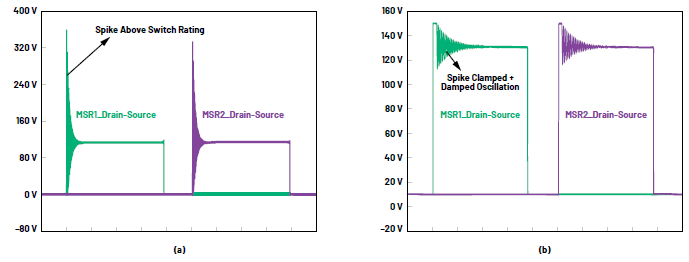 有源箝位:圖5a顯示在次級開關(guān)MR1和MR2關(guān)斷期間,在其漏源電壓上觀察到很大的尖峰和振鈴。這些瞬態(tài)事件會危及開關(guān)的完整性,浪費能量,并導(dǎo)致電磁干擾(EMI)。使用附加開關(guān)(例如圖3中的MCLAMP)實現(xiàn)數(shù)字控制有源箝位是減輕該尖峰負面影響的較佳備選方案6。這樣可以進一步提高該架構(gòu)的效率。應(yīng)用某種形式有源箝位的結(jié)果如圖5b所示。