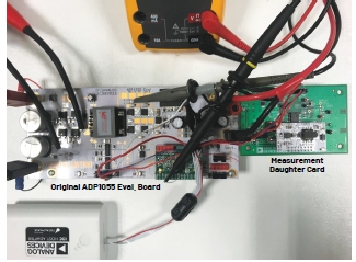 基于ADuM4195的測量方案是對控制環(huán)路硬件的一項重要補充。除了安全的5 kV隔離電壓(從高壓初級側(cè)到低壓控制側(cè))、多達4.3 V的寬輸入范圍以及精度約為0.5%的基準電壓外,ADuM4195還有高達200 kHz的最小帶寬。與典型的并聯(lián)穩(wěn)壓器和光耦合器解決方案相比,它支持實現(xiàn)更快的環(huán)路操作,從而提供更好的瞬態(tài)響應(yīng),這對于應(yīng)用在125 kHz開關(guān)頻率下的運行至關(guān)重要。圖7顯示了最終的實驗裝置,圖6中增加的硬件在基于ADuM4195的測量子卡中實現(xiàn),該子卡已添加到ADP1055-EVALZ用戶指南中的原始評估板中。