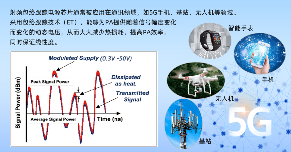 在5G智能時(shí)代,包絡(luò)跟蹤技術(shù)(ET)因其能夠?yàn)樯漕l功率放大器(PA)提供動(dòng)態(tài)變化的電源,降低功耗、提高效率,備受關(guān)注。相信隨著5G網(wǎng)絡(luò)的進(jìn)一步建設(shè)與5G終端的快速普及,將極大地帶動(dòng)ET在智能手機(jī)、手表、無(wú)人機(jī)等無(wú)線(xiàn)通信領(lǐng)域的市場(chǎng)需求量。