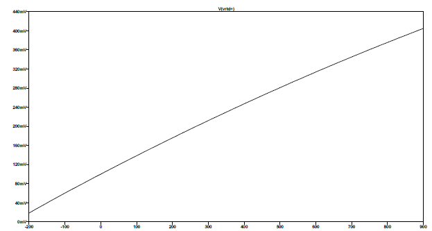 1.運行SPICE仿真(使用掃描參數(shù)),確認(rèn)RTD輸出電壓與給定溫度的預(yù)期輸出一致。請注意,Vrtd = (Vrtd+) – (Vrtd-)