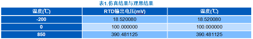 仿真使用1mA激勵電流進(jìn)行-200°C至850°C的RTD溫度掃描。表1顯示了RTD輸出電壓的仿真值與計算值示例(使用Callendar-Van Dusen方程)。