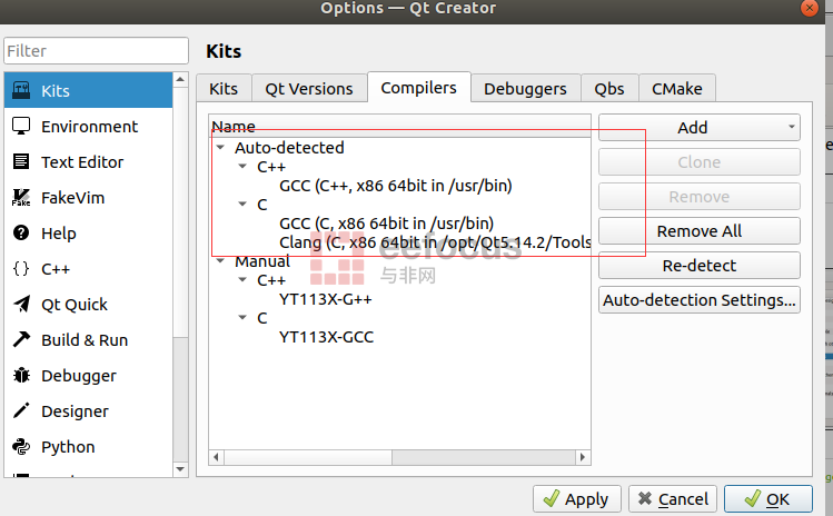 3、配置Qt的編譯套件,這里就是關(guān)鍵的地方,配好了,就能愉快的使用ide開發(fā)。默認(rèn)安裝好Qt,同時(shí)系統(tǒng)也安裝好了gcc等軟件,那么在工具設(shè)置的界面可以看到默認(rèn)的Kit,基于X86的gcc。