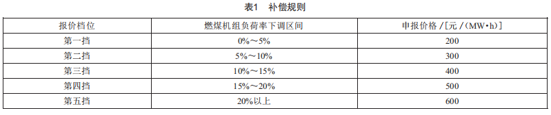 當(dāng)前市場啟動(dòng)條件包括三種情況:一是在日前或日內(nèi)進(jìn)行負(fù)荷預(yù)測和計(jì)算負(fù)荷備用,當(dāng)預(yù)計(jì)某電網(wǎng)負(fù)荷備用小于裕度值,需要將一臺(tái)及以上并網(wǎng)機(jī)組降至有償調(diào)峰基準(zhǔn)值以下時(shí):二是有網(wǎng)內(nèi)棄水電廠需要購買輔助服務(wù)時(shí):三是網(wǎng)外清潔能源消納困難,需要購買某調(diào)峰輔助服務(wù)時(shí),開展深度調(diào)峰交易。機(jī)組在有償調(diào)峰基準(zhǔn)的基礎(chǔ)上,采用下調(diào)容量比率形式分擋報(bào)價(jià)。燃煤機(jī)組以5%容量作為一個(gè)報(bào)價(jià)檔位,由第一擋至第五擋按照價(jià)格遞增的原則逐段申報(bào),最大下調(diào)功率自行確定市場初期對每擋申報(bào)價(jià)格設(shè)置價(jià)格上限。其中補(bǔ)償規(guī)則如表1所示。