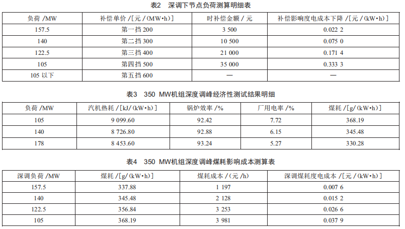 根據(jù)公式(1)(2)可以得出350MW機(jī)組深度調(diào)峰煤耗影響成本測算表,如表4所示。