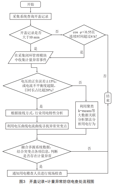 根據(jù)開蓋記錄+計(jì)量異常分析、篩選和排查方法設(shè)計(jì)流程圖,如圖3所示,開蓋記錄+任一計(jì)量異常都可通過該方法查處。