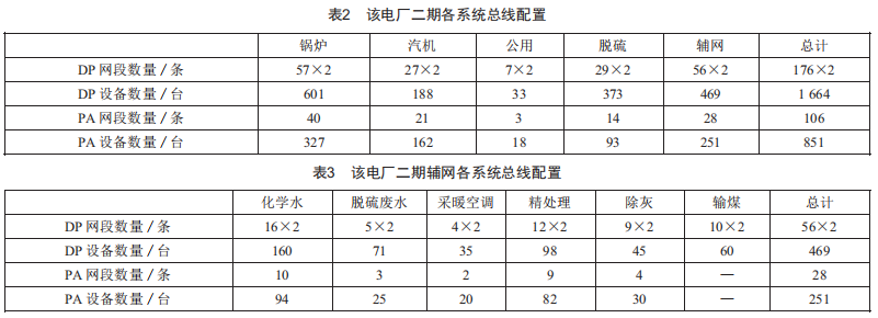 maxDNA控制系統(tǒng)所設(shè)計網(wǎng)段中,DР總線為雙路冗余設(shè)計模式,РA總線為單路設(shè)計模式。某電廠二期各系統(tǒng)總線配置如表2所示,輔網(wǎng)各系統(tǒng)總線配置如表3所示。DP網(wǎng)段數(shù)量共計176×2條,DP設(shè)備數(shù)量約1664臺:PA網(wǎng)段數(shù)量設(shè)計為106條,PA設(shè)備數(shù)量約851臺。